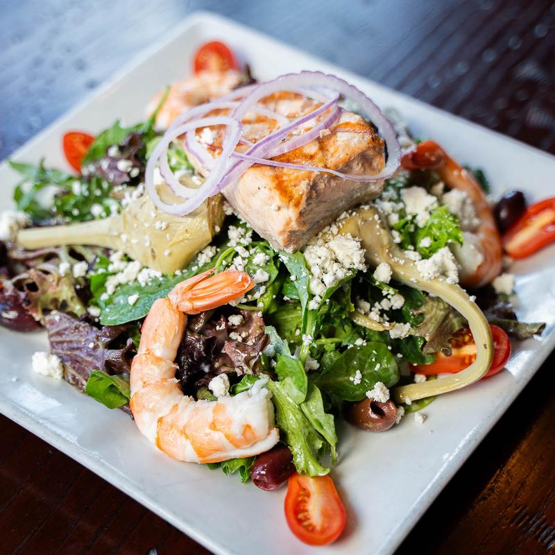 Mixed greens, chilled jumbo shrimp, colossal crab, grilled salmon, roman artichokes, red onion, grape tomatoes, kalamata olives, feta, lemon basil vinaigrette