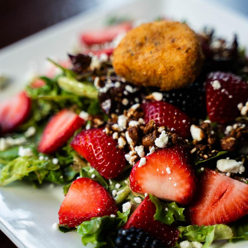 Mixed greens, warm deep-fried goat cheese, seasonal berries, homemade balsamic vinaigrette, balsamic glaze drizzle